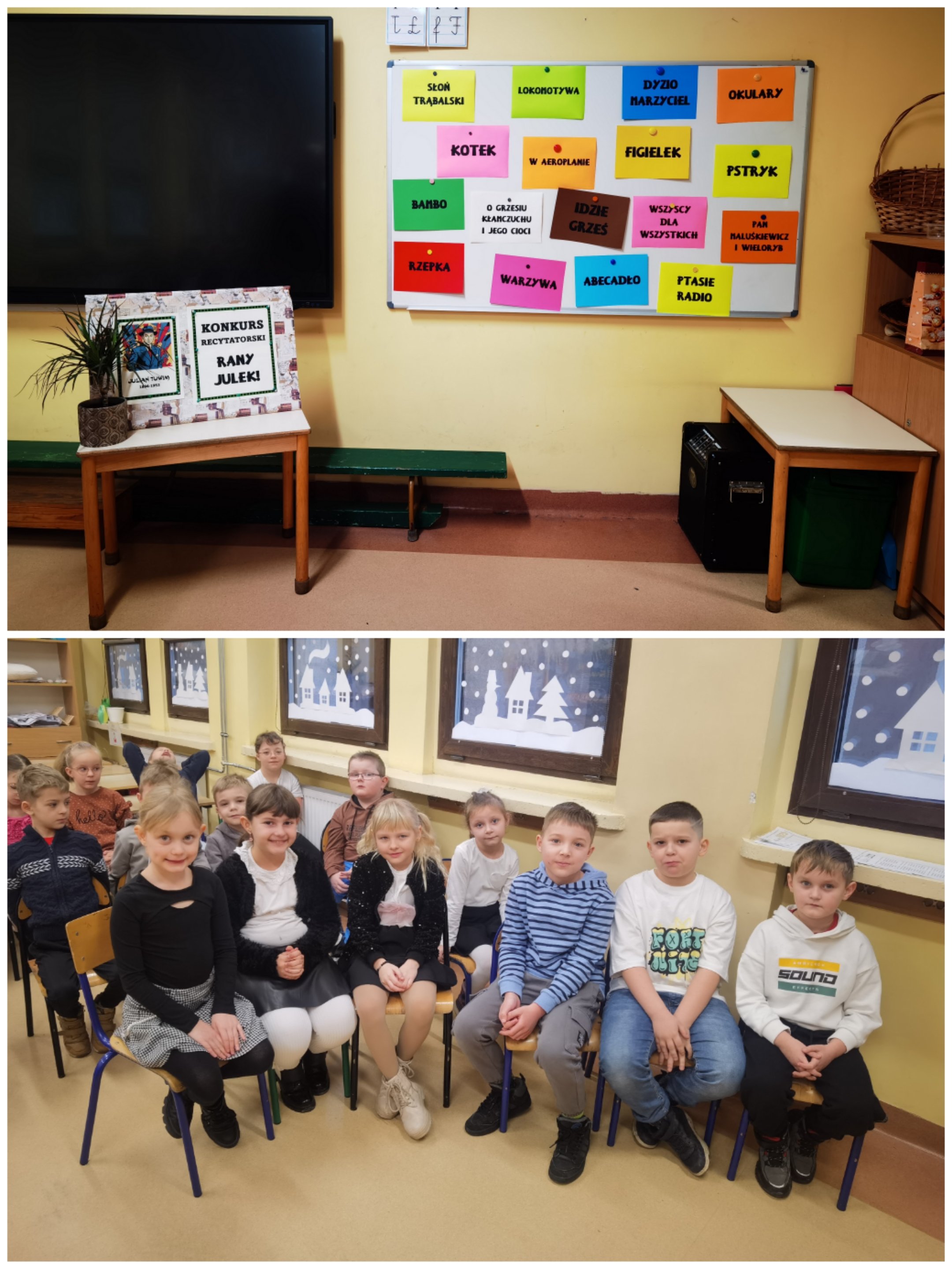 W konkursie, który odbędzie się 4 lutego 2026 roku, każdą zaproszoną szkołę może reprezentować jedno dziecko w każdej z trzech kategorii wiekowych. Nasze reprezentantki klas I, II i III wyłonione zostały podczas eliminacji konkursowych, które odbyły się w dniu 16 stycznia 2026 roku z udziałem wszystkich chętnych pierwszo-, drugo- i trzecioklasistów. W piątkowe przedpołudnie w recytatorskie szranki stanęło 25 uczennic i 6 uczniów klas I-III: 4 uczennice i 3 uczniów klas I, 12 uczennic i 1 uczeń klas II oraz 9 uczennic i 2 uczniów klas III, którzy zaprezentowali takie wiersze Juliana Tuwima, jak: ,,Bambo’’, ,,Zosia Samosia’’, ,,Dyzio marzyciel’’, ,,Kotek’’, ,,Okulary’’, ,,Wszyscy dla wszystkich’’, ,,O panu Tralalińskim’’, ,,Spóźniony słowik’’, ,,Idzie Grześ’’, ,,Abecadło’’, ,,Cuda i dziwy’’, ,,Tańcowały dwa Michały’’ oraz ,,Lokomotywa’’.