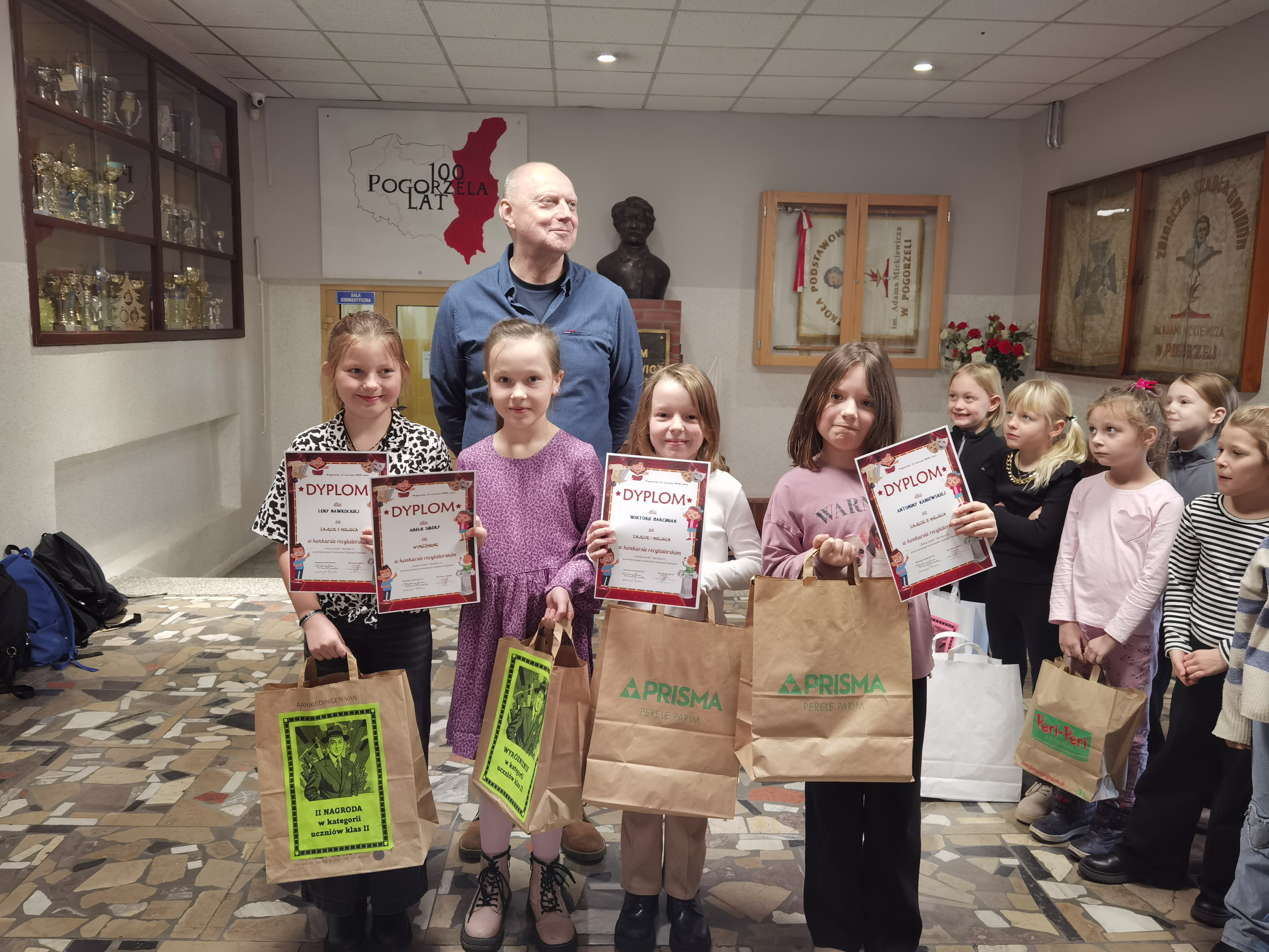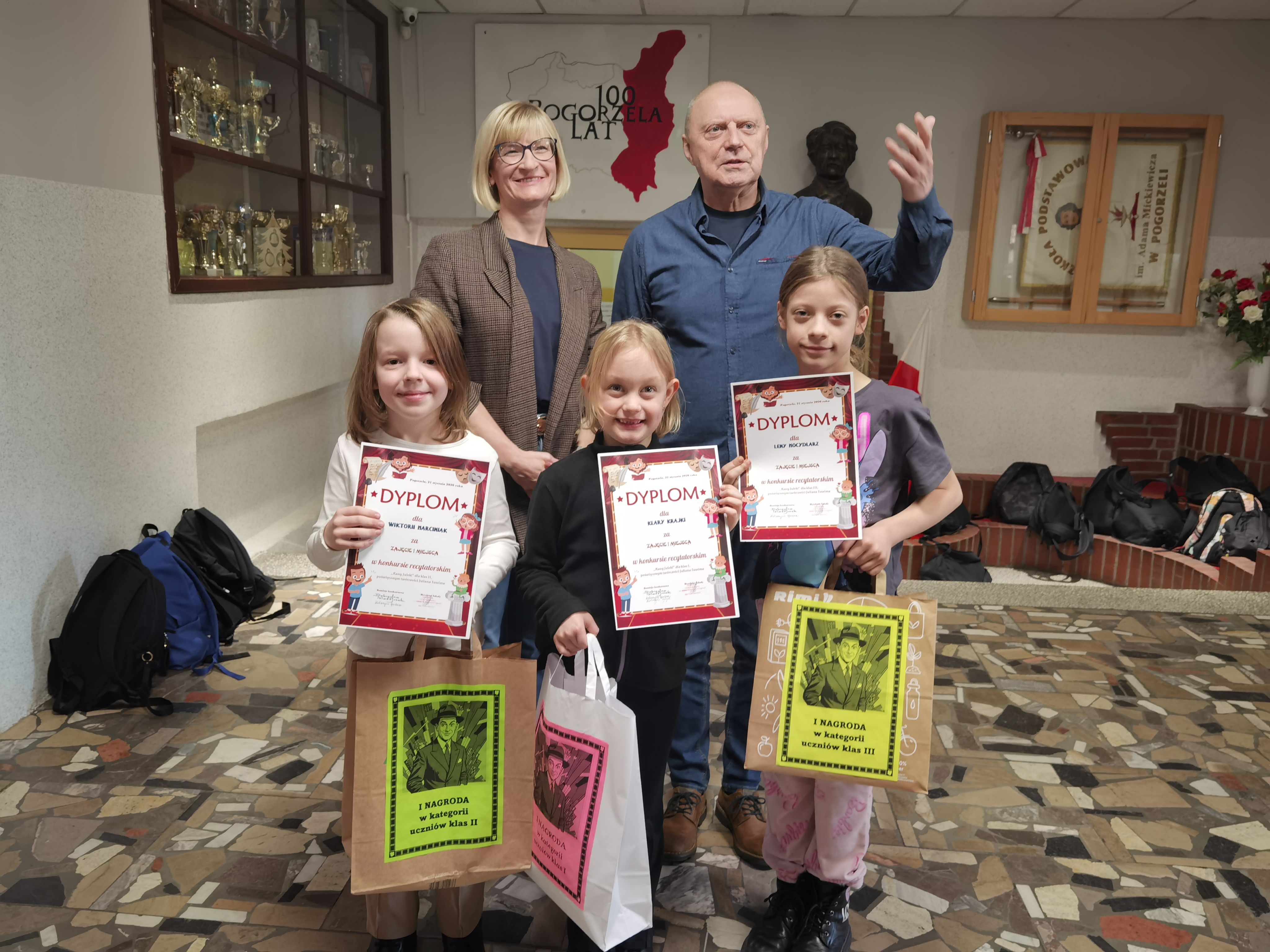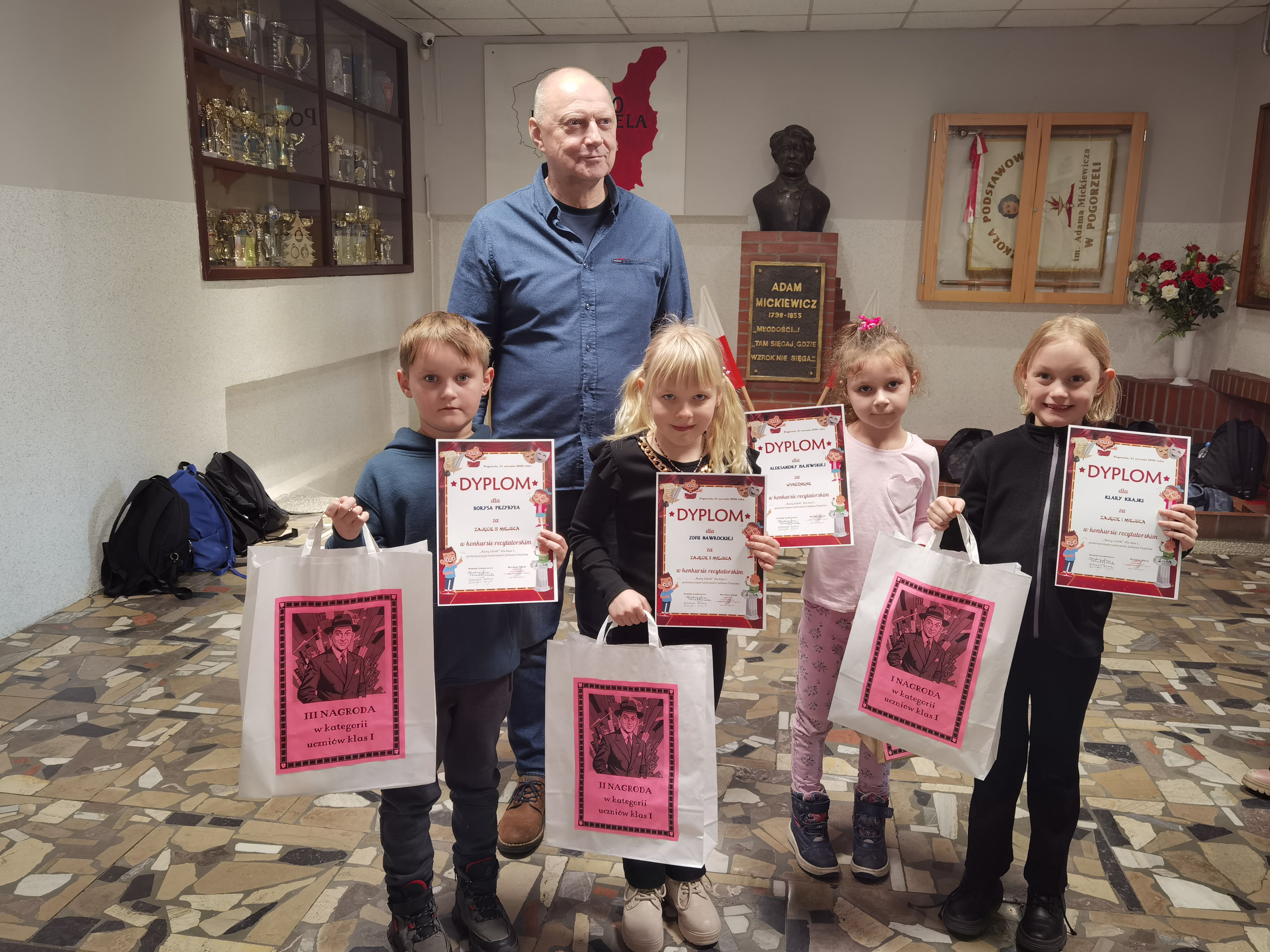 W dniu 21 stycznia 2026 roku laureatki i laureaci konkursu otrzymali ufundowane przez Radę Rodziców przy naszej Szkole Podstawowej im. Adama Mickiewicza w Pogorzeli nagrody i dyplomy, które wręczył im Dyrektor Szkoły, p. Paweł Marciniak. Wszystkie uczestniczki i wszyscy uczestnicy obdarowani zostali natomiast ,,szpiegowskimi’’ długopisami (służącymi do zapisywania, a następnie odczytywania cytatów z twórczości Juliana Tuwima w świetle emitowanym przez latarkę zamontowaną we wspomnianym przyborze piśmienniczym).