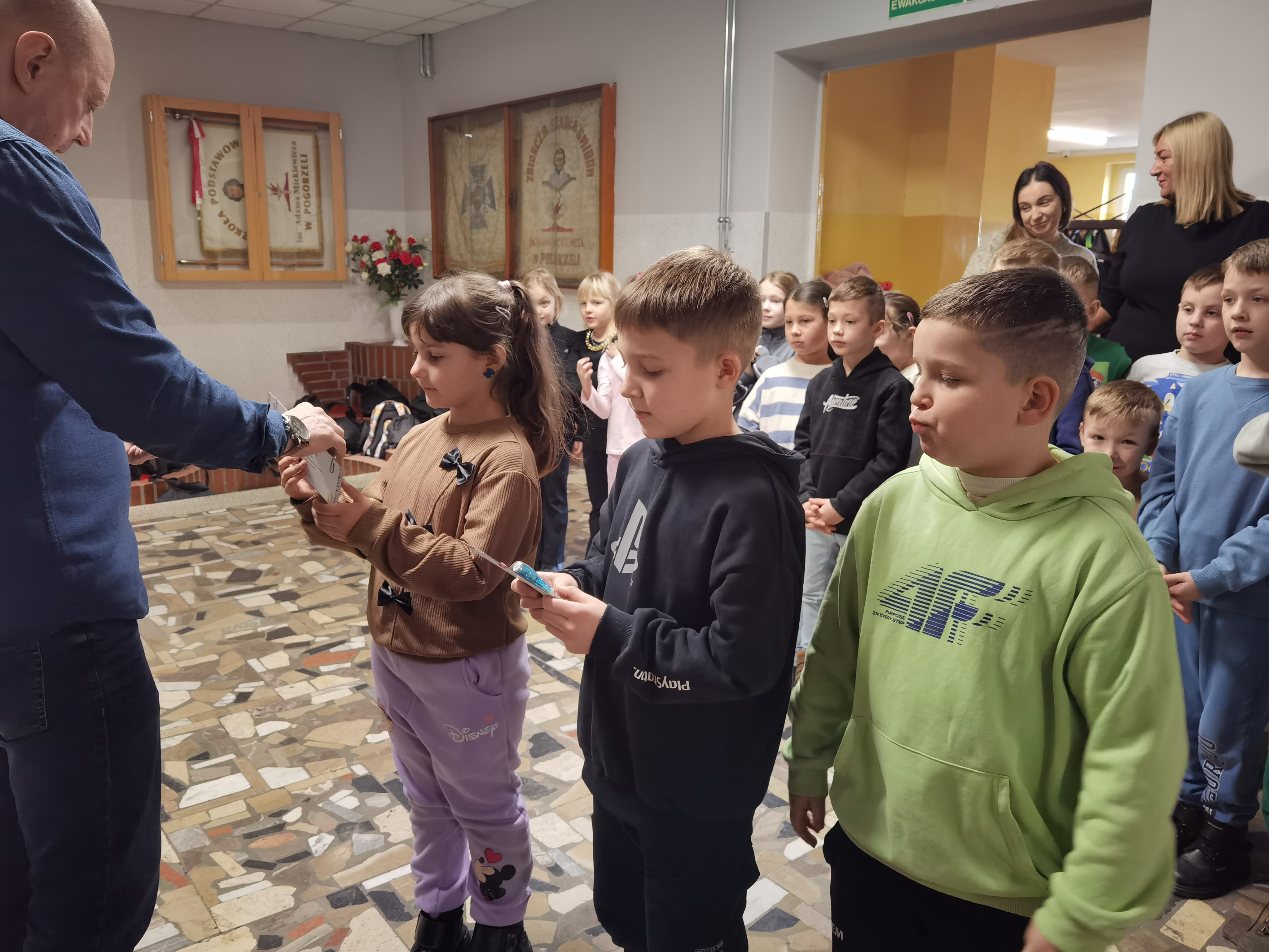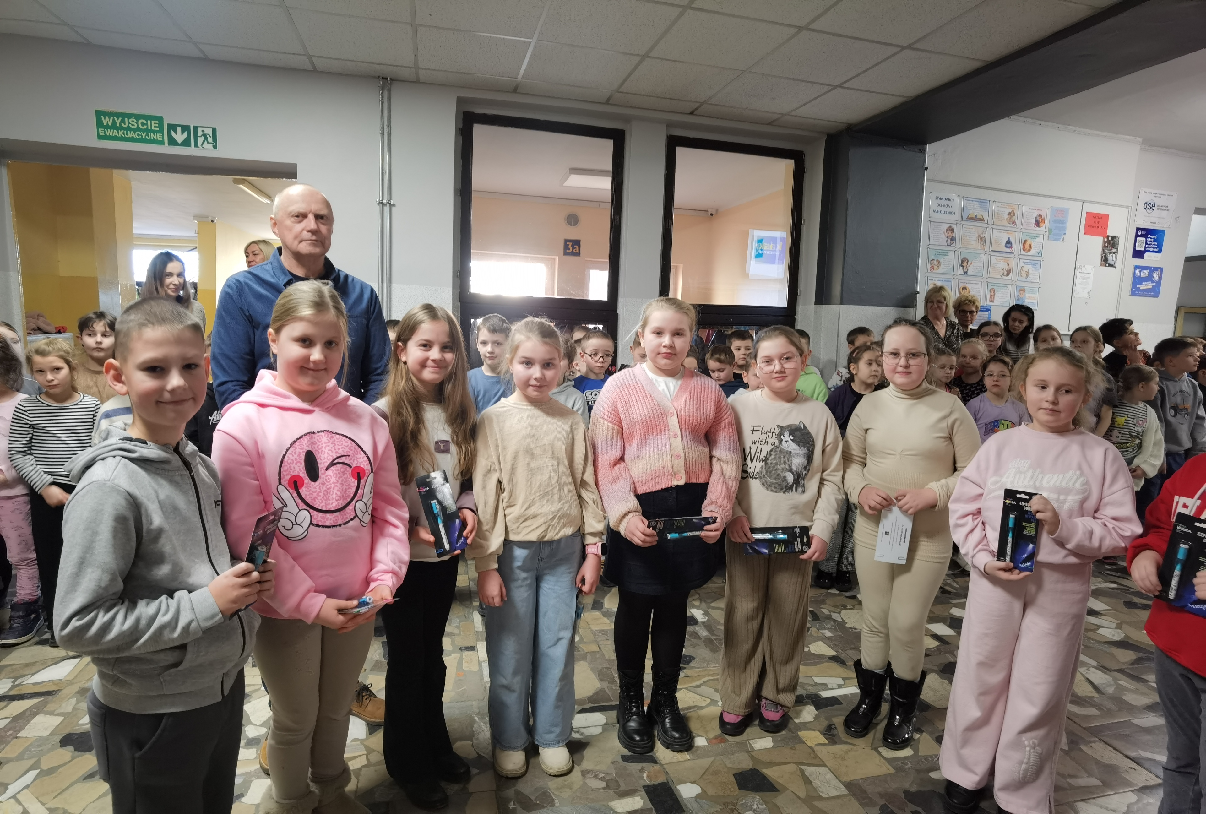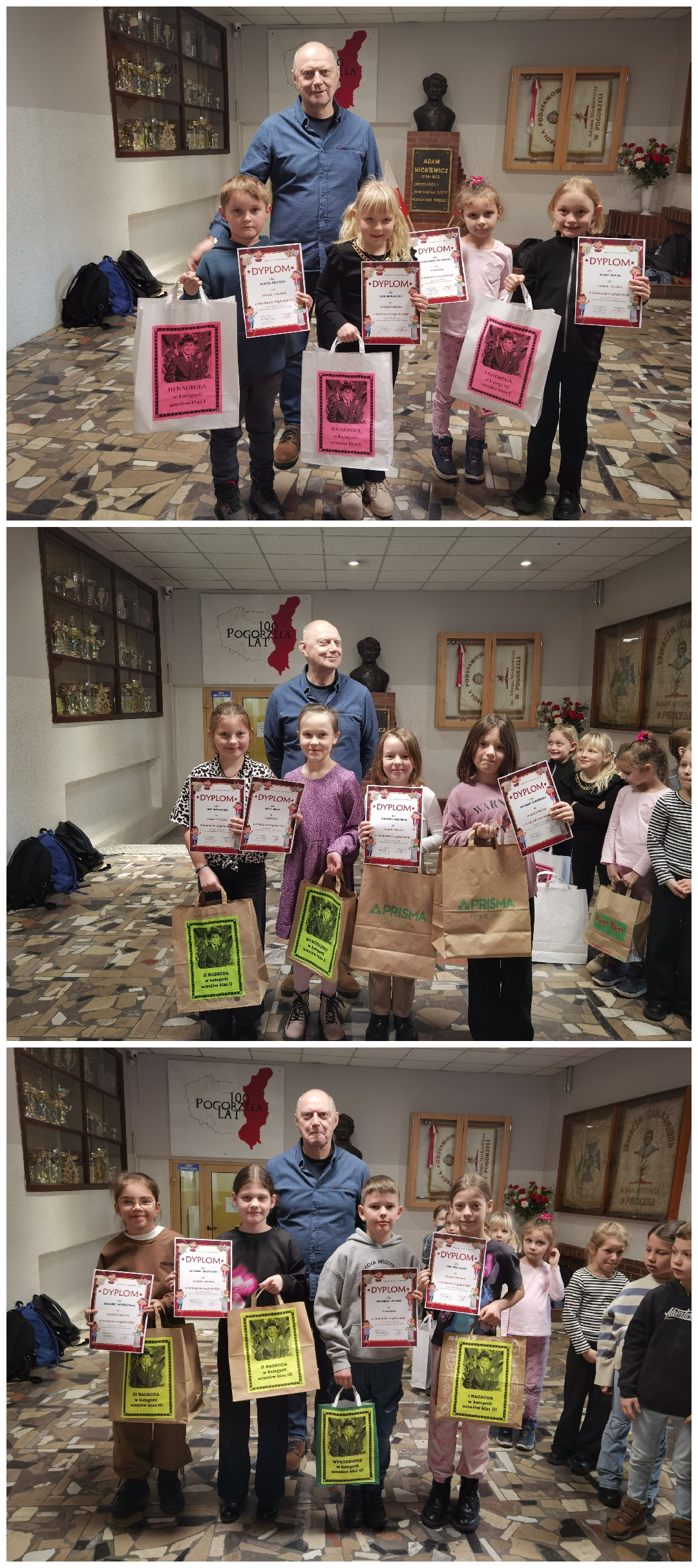 W dniu 21 stycznia 2026 roku laureatki i laureaci konkursu otrzymali ufundowane przez Radę Rodziców przy naszej Szkole Podstawowej im. Adama Mickiewicza w Pogorzeli nagrody i dyplomy, które wręczył im Dyrektor Szkoły, p. Paweł Marciniak. Wszystkie uczestniczki i wszyscy uczestnicy obdarowani zostali natomiast ,,szpiegowskimi’’ długopisami (służącymi do zapisywania, a następnie odczytywania cytatów z twórczości Juliana Tuwima w świetle emitowanym przez latarkę zamontowaną we wspomnianym przyborze piśmienniczym).