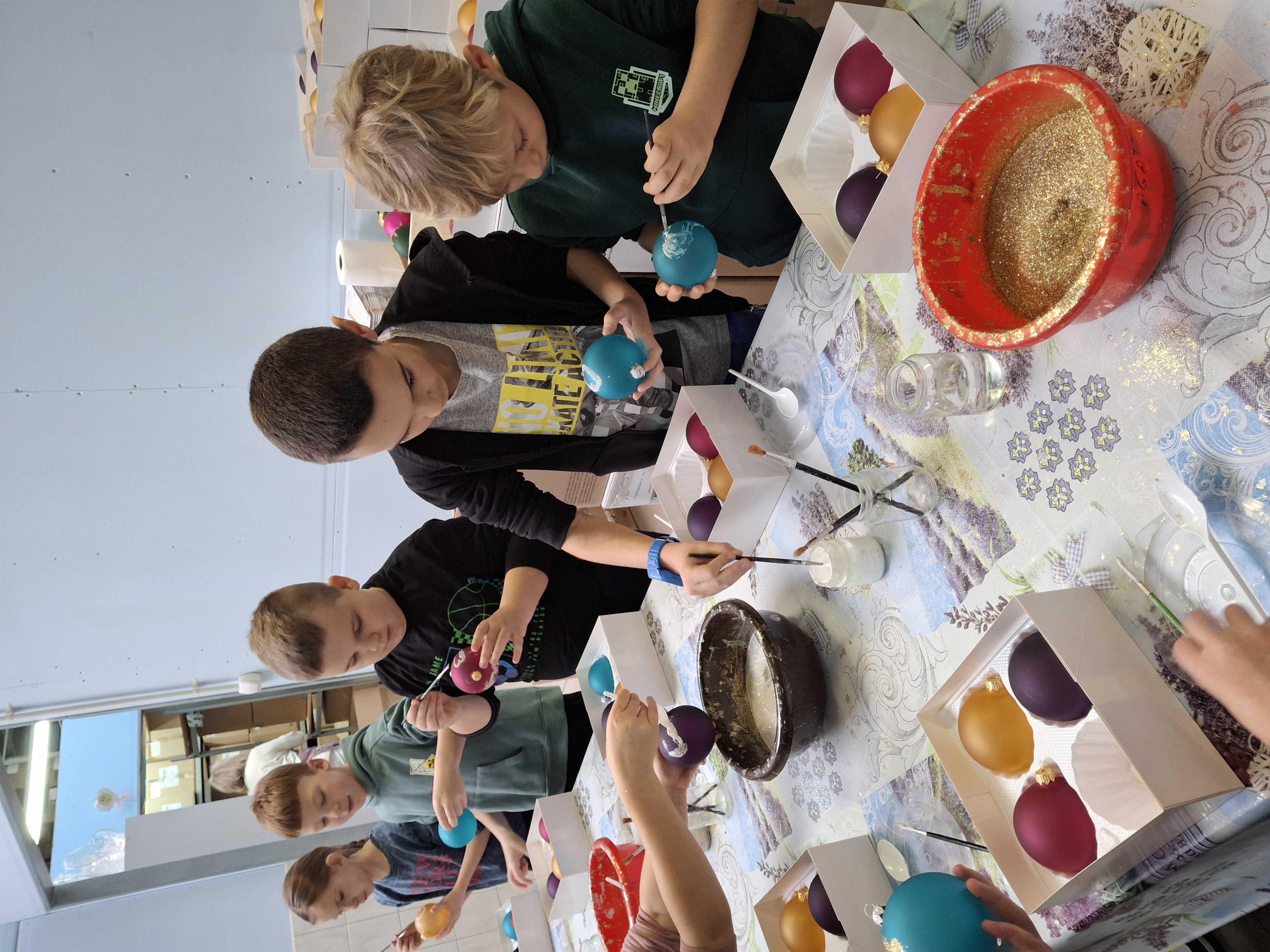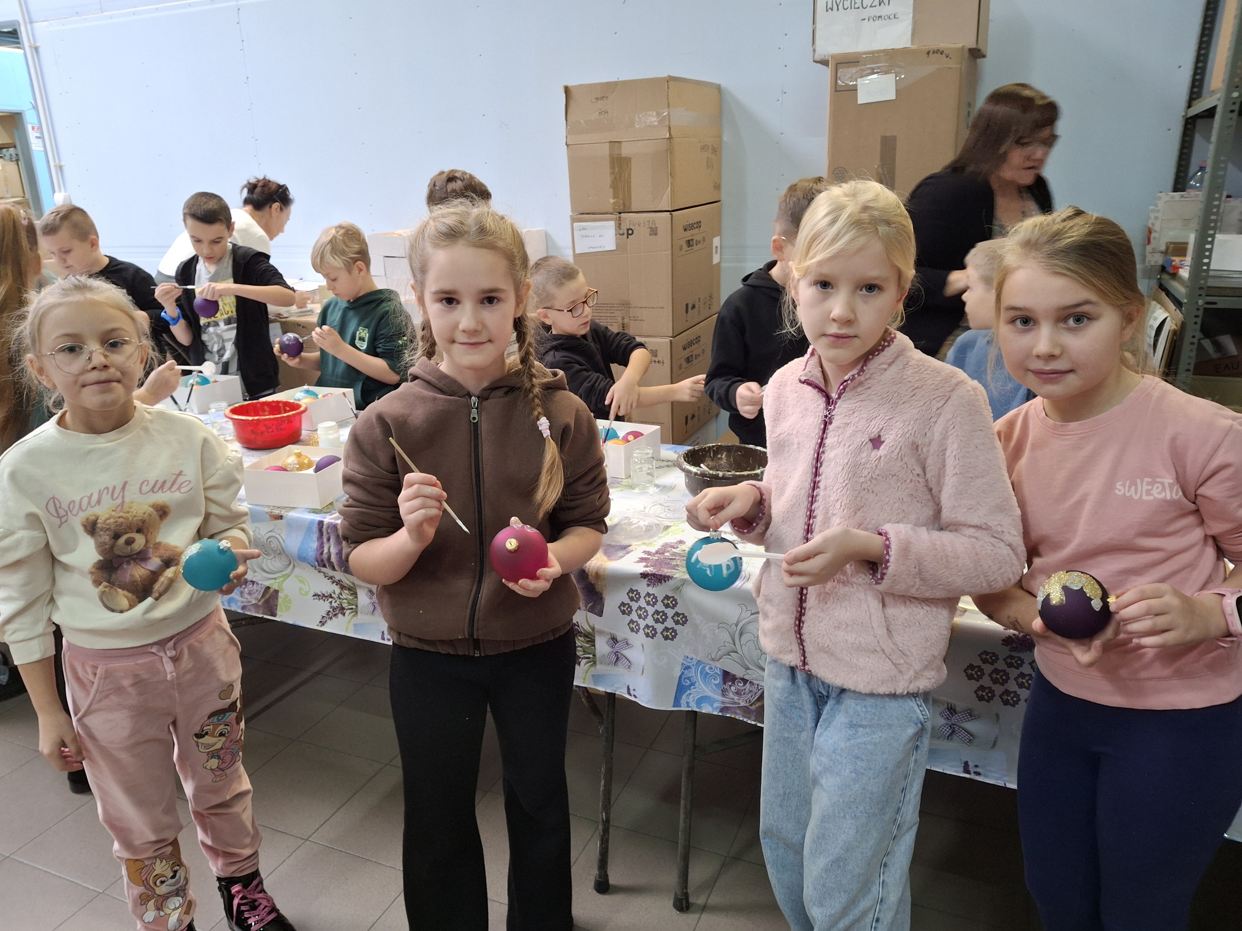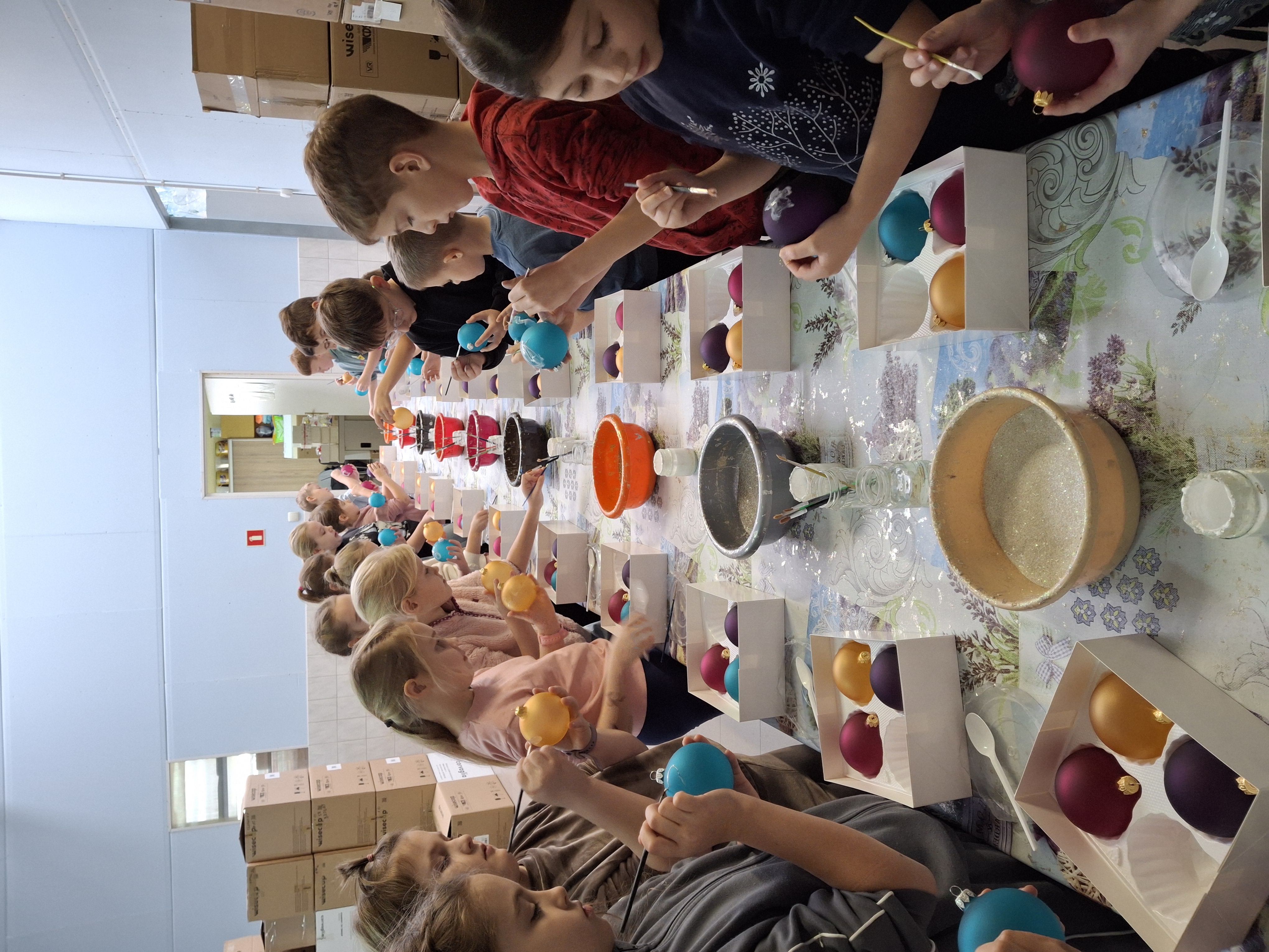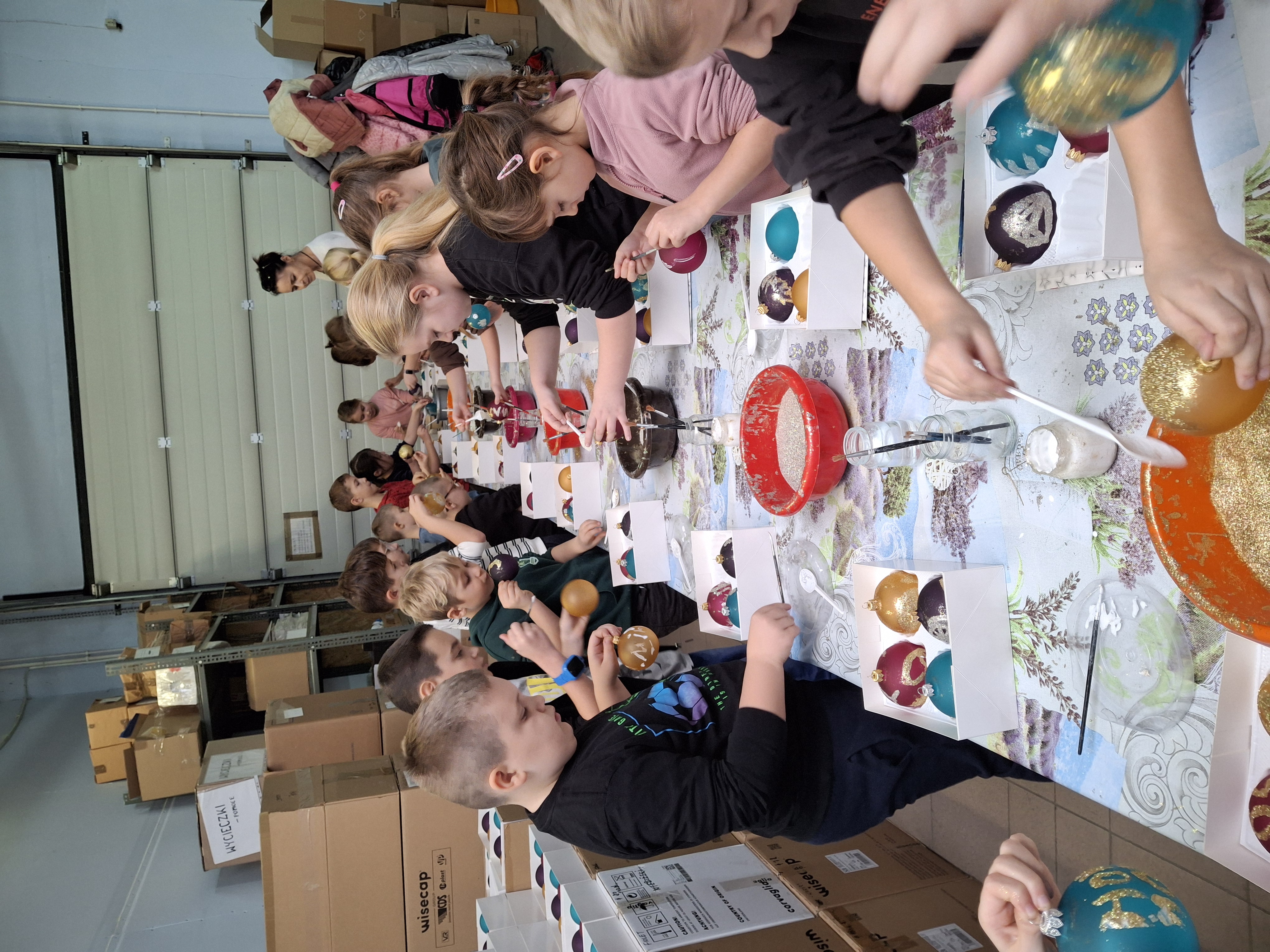 Największą atrakcją dla uczniów okazały się warsztaty plastyczne przygotowane na zakończenie wizyty. Każde dziecko miało możliwość własnoręcznie ozdobić cztery bombki, wykorzystując farby i brokat. Gotowe ozdoby zostały pięknie zapakowane, aby uczniowie mogli bezpiecznie zabrać je do domu i pochwalić się efektem swojej pracy.