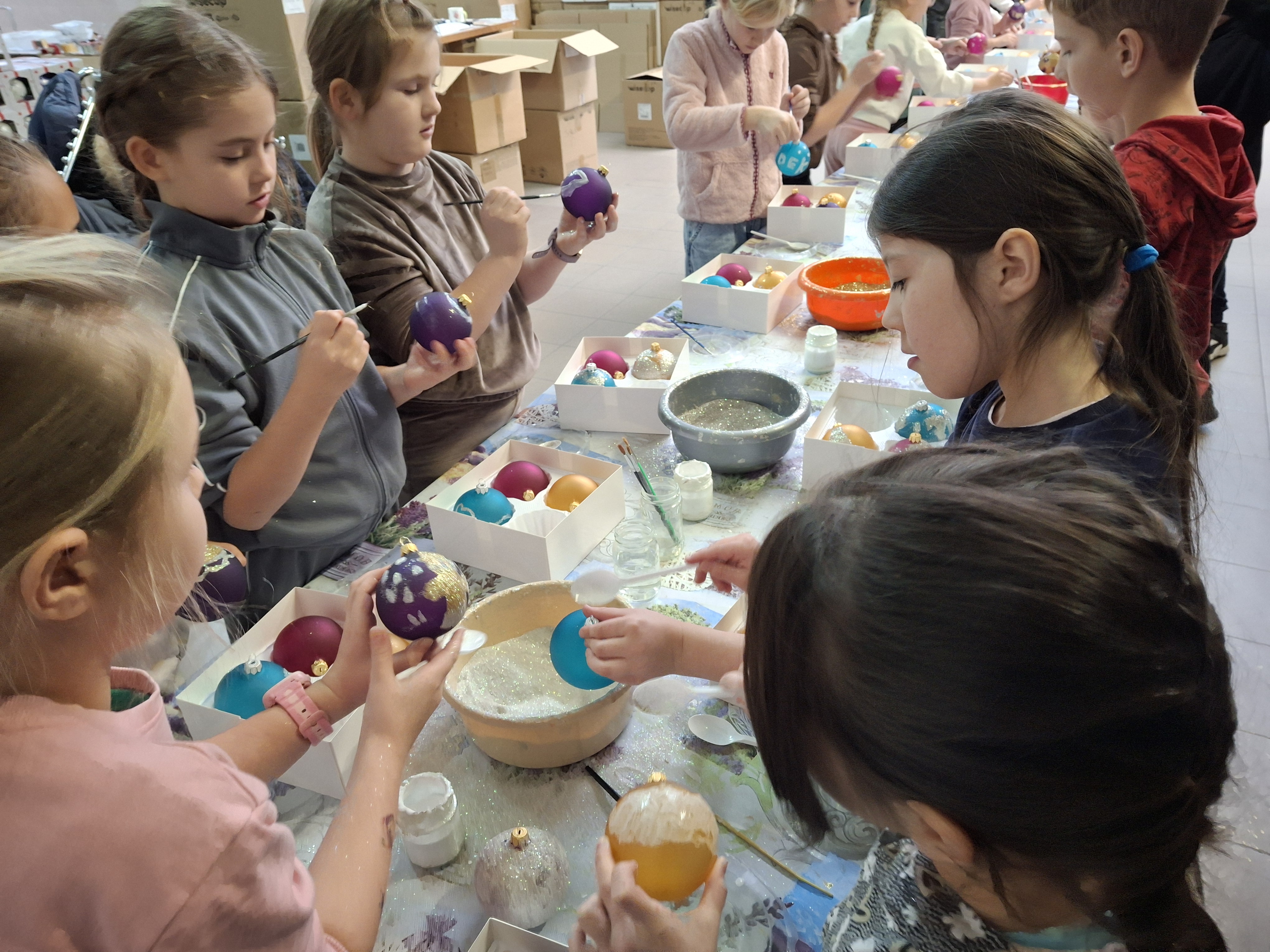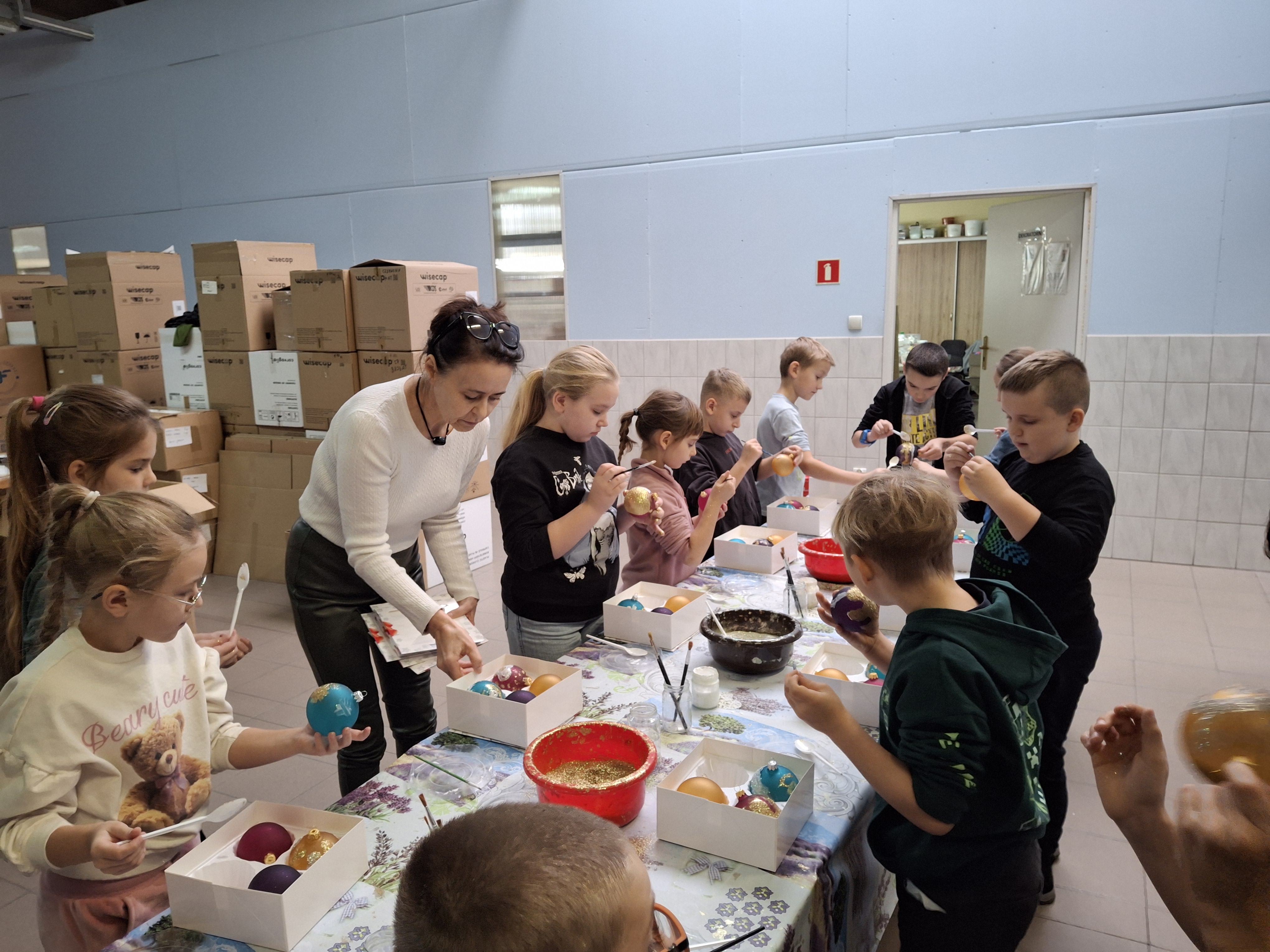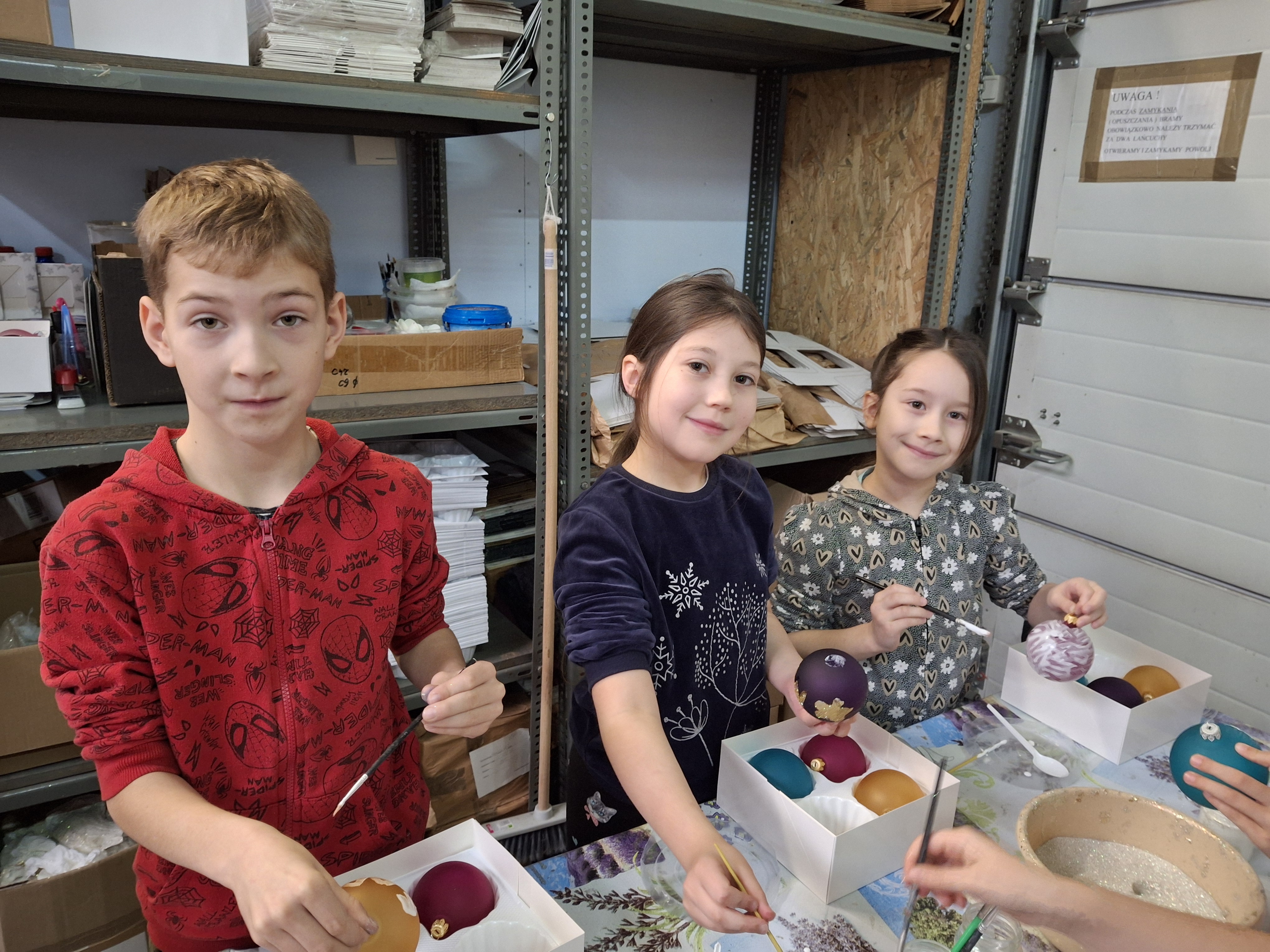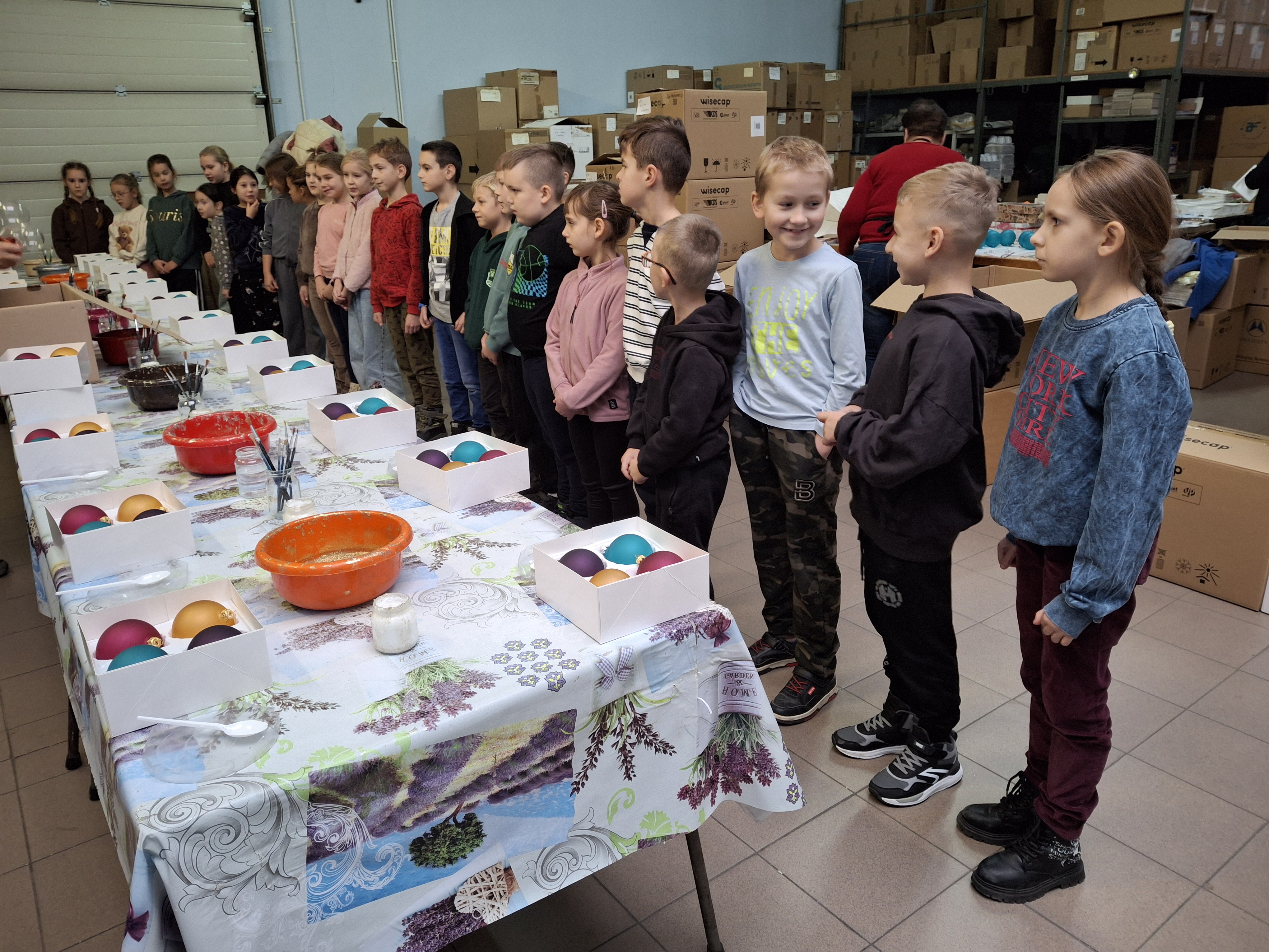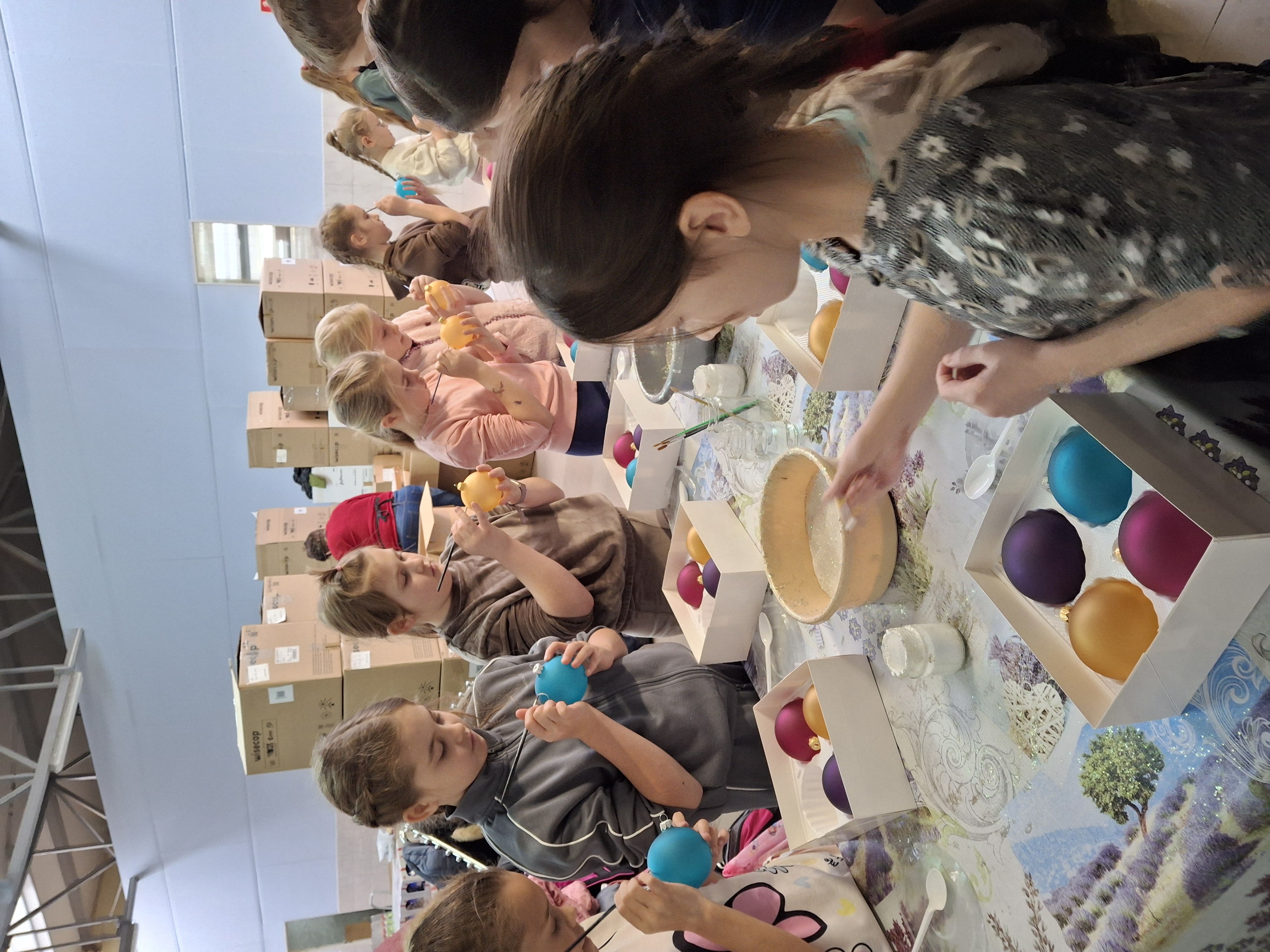Największą atrakcją dla uczniów okazały się warsztaty plastyczne przygotowane na zakończenie wizyty. Każde dziecko miało możliwość własnoręcznie ozdobić cztery bombki, wykorzystując farby i brokat. Gotowe ozdoby zostały pięknie zapakowane, aby uczniowie mogli bezpiecznie zabrać je do domu i pochwalić się efektem swojej pracy.