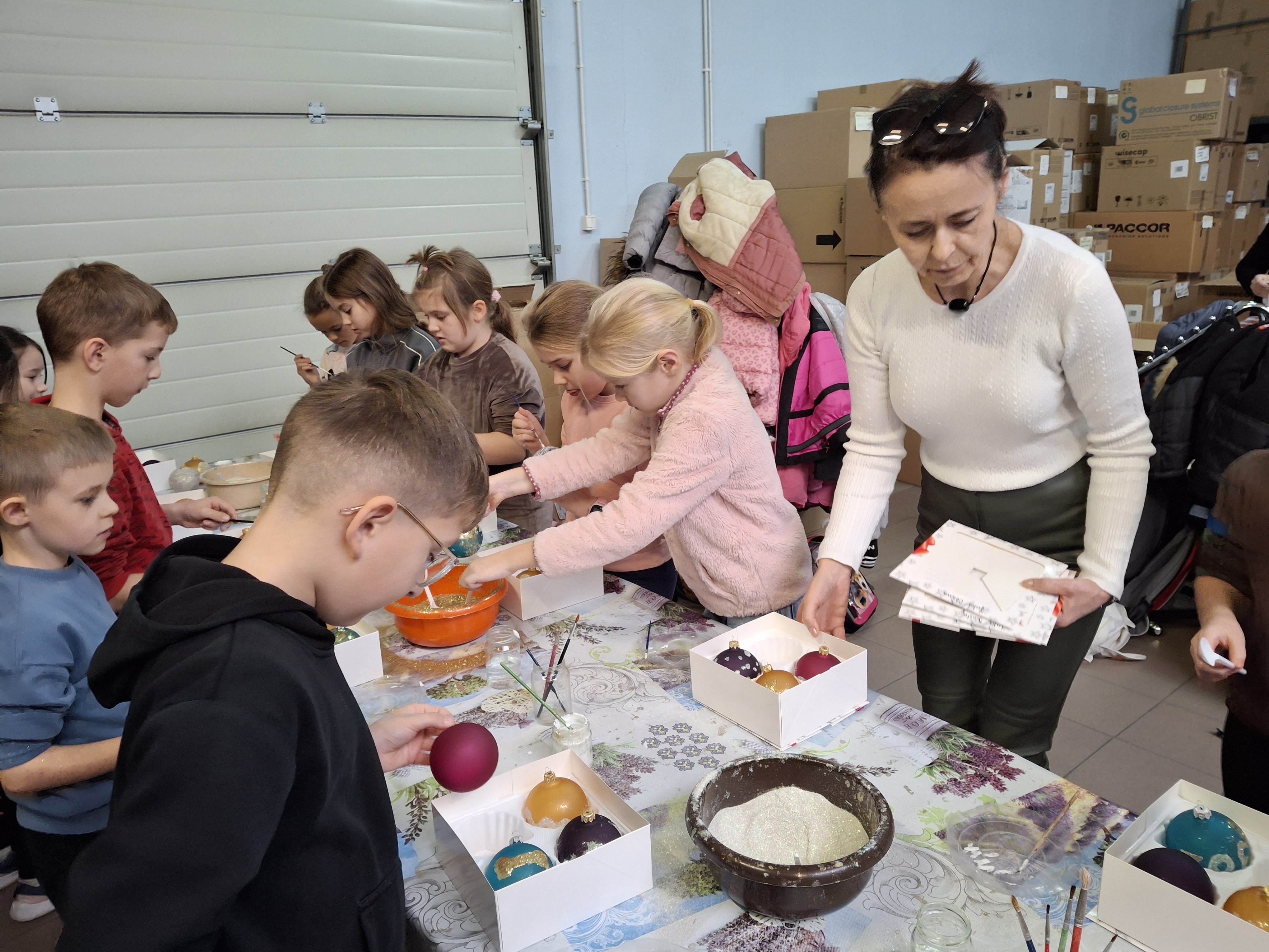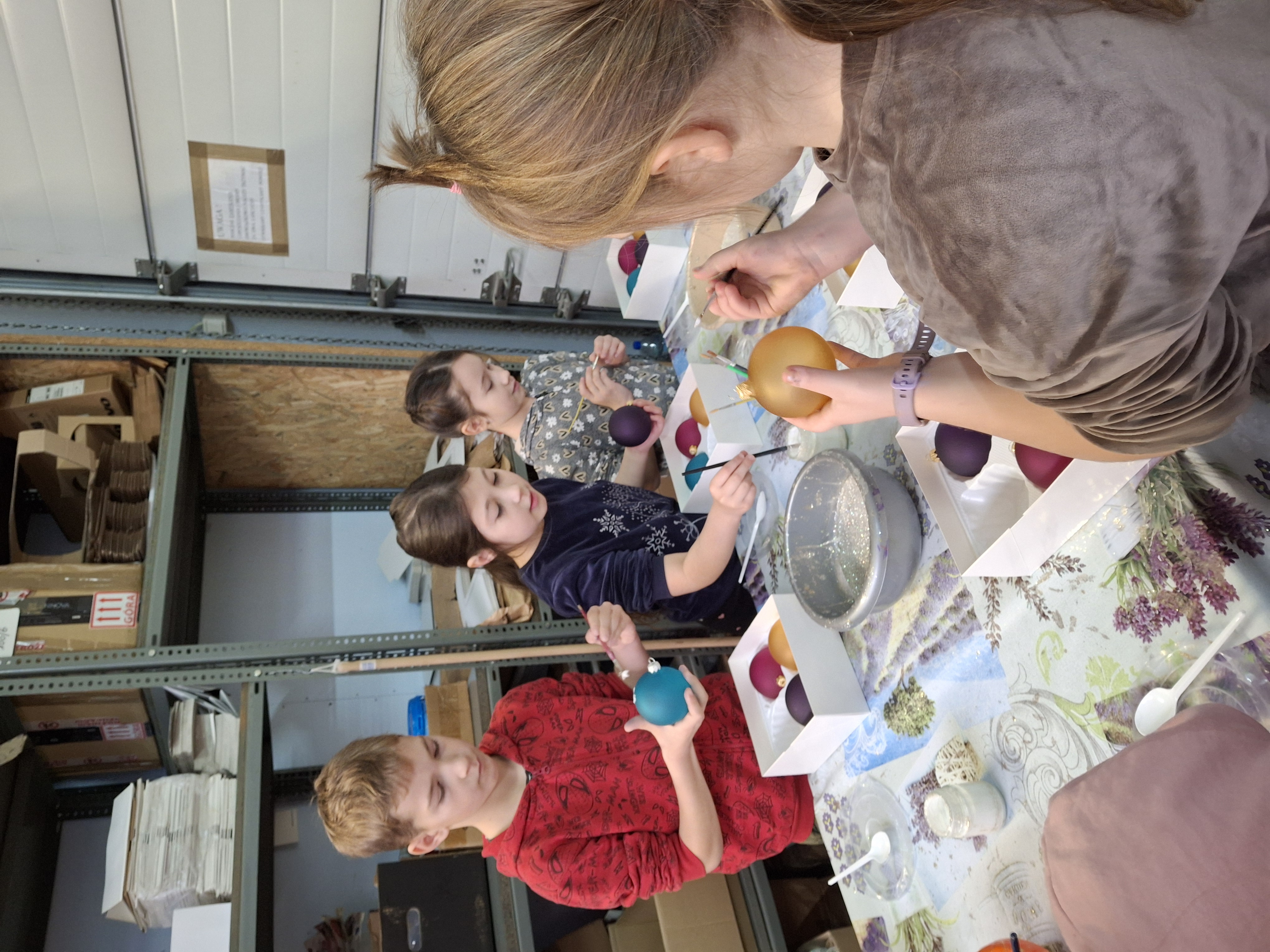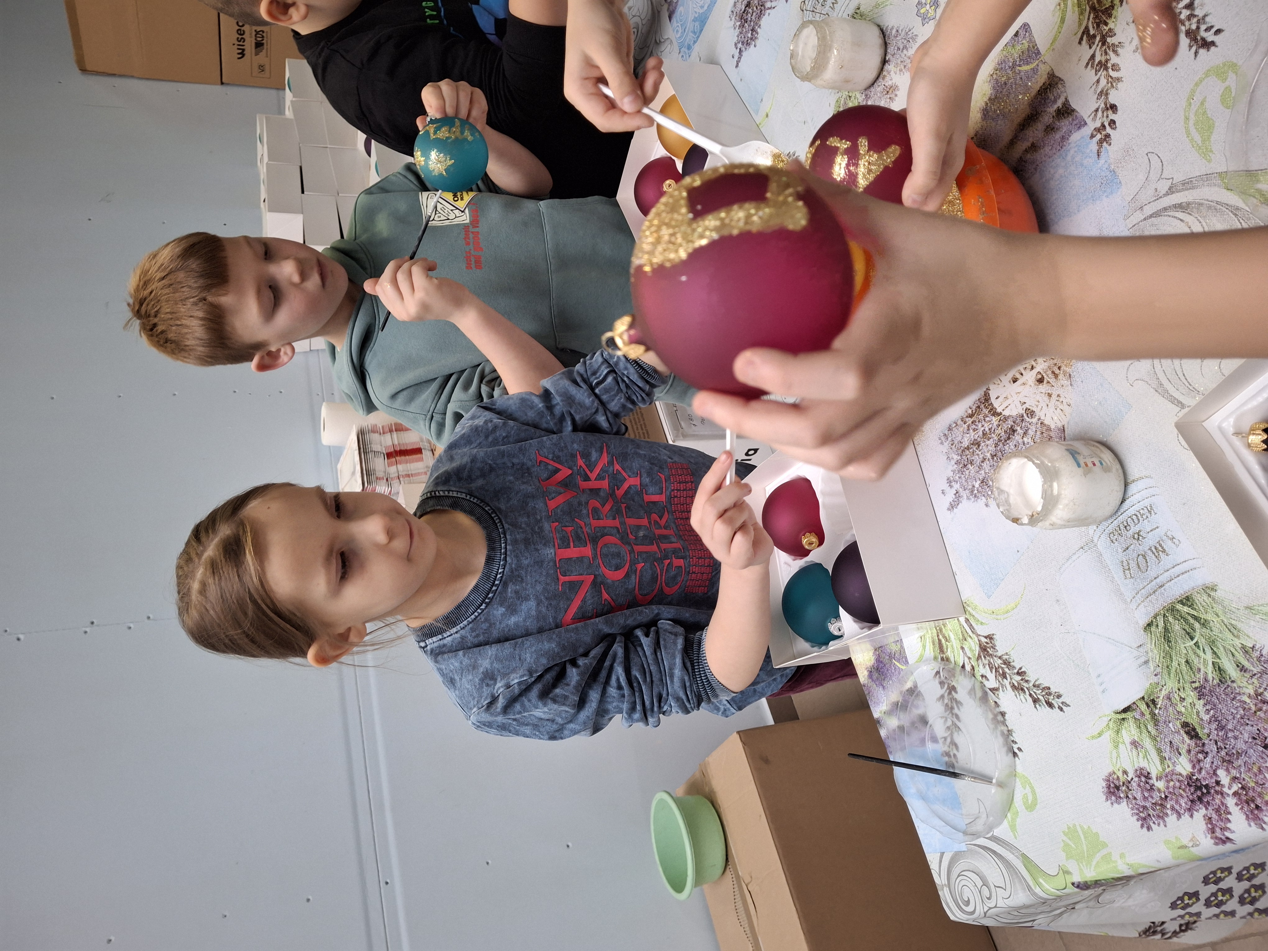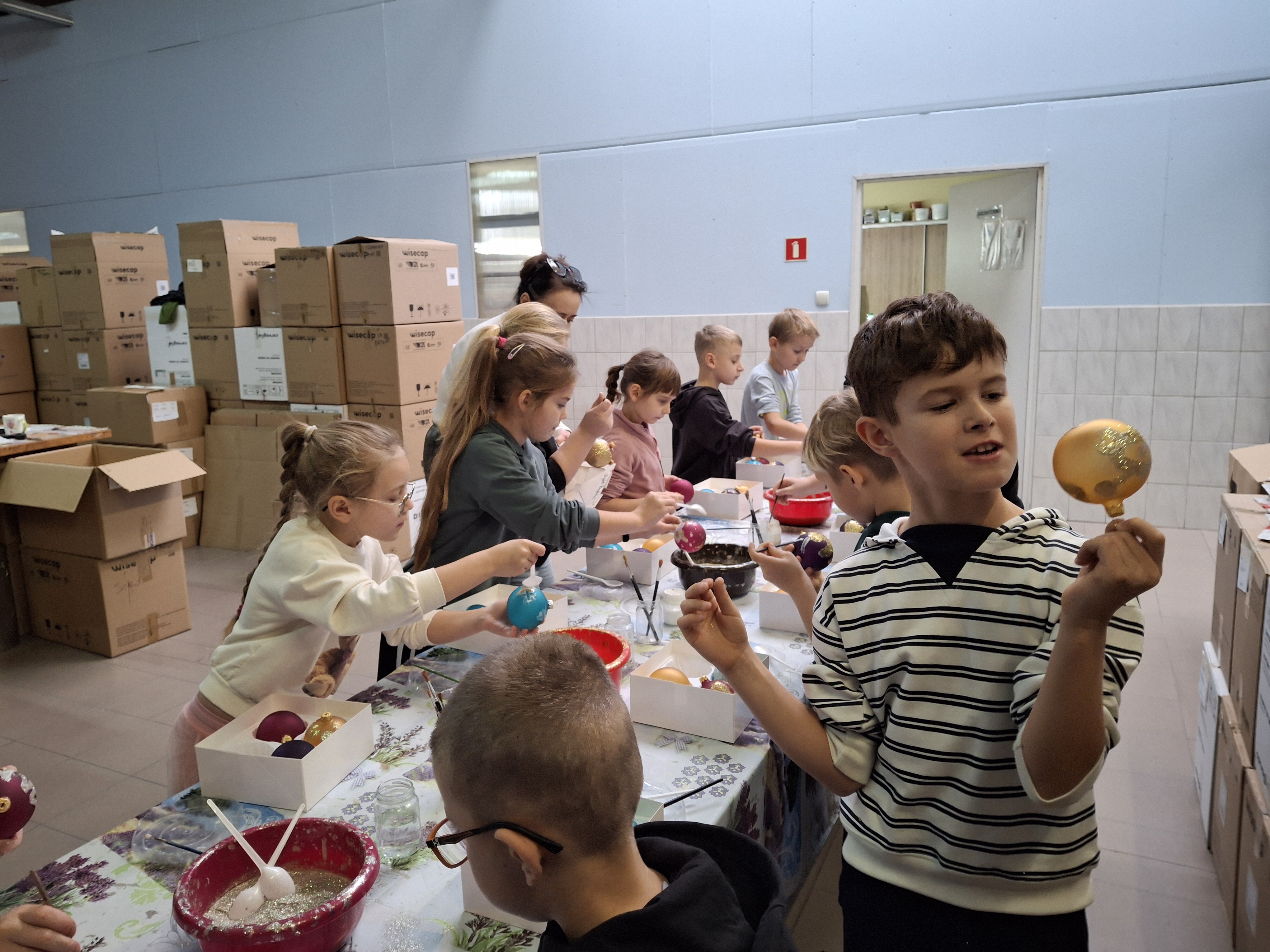 Największą atrakcją dla uczniów okazały się warsztaty plastyczne przygotowane na zakończenie wizyty. Każde dziecko miało możliwość własnoręcznie ozdobić cztery bombki, wykorzystując farby i brokat. Gotowe ozdoby zostały pięknie zapakowane, aby uczniowie mogli bezpiecznie zabrać je do domu i pochwalić się efektem swojej pracy.