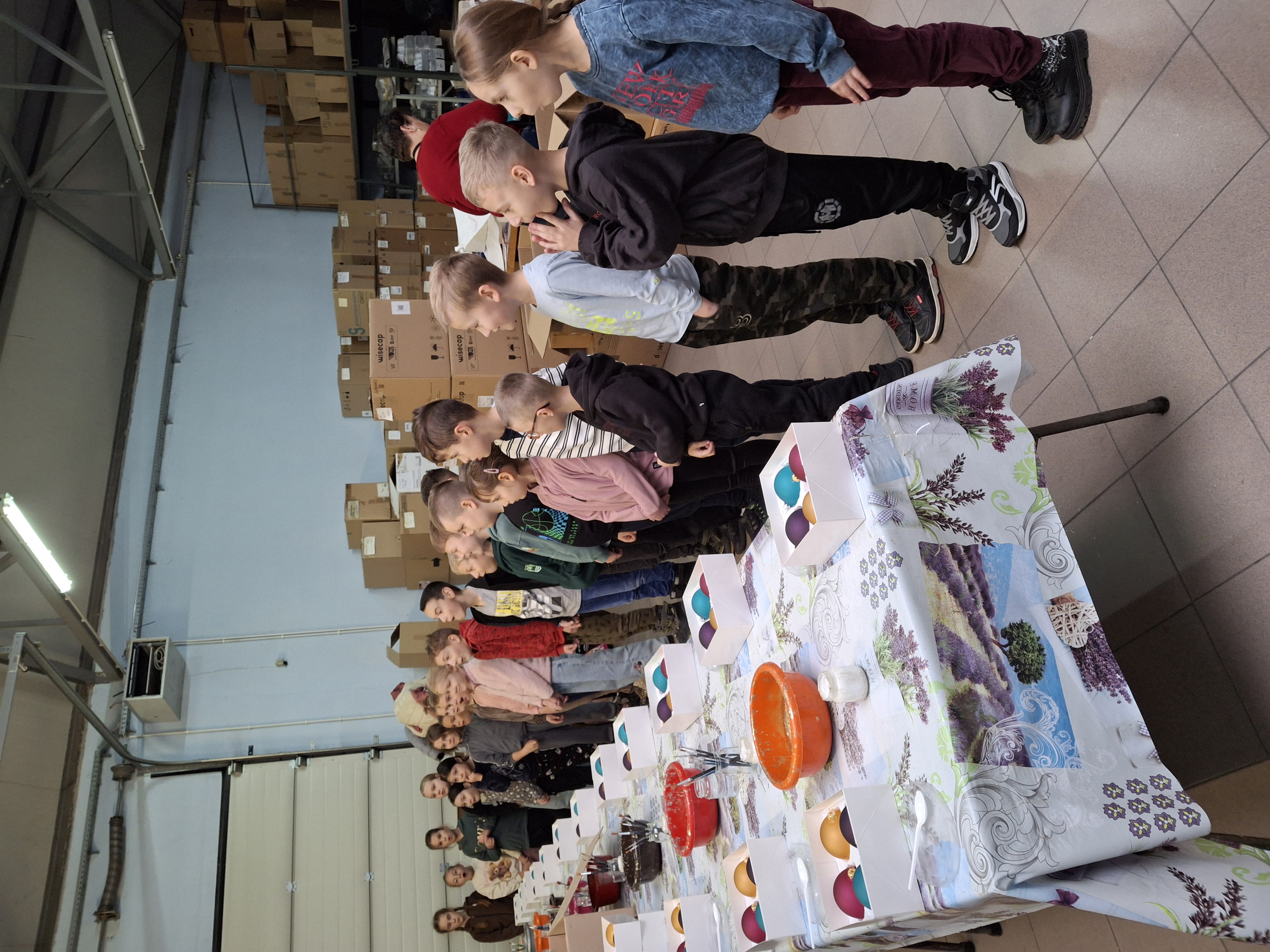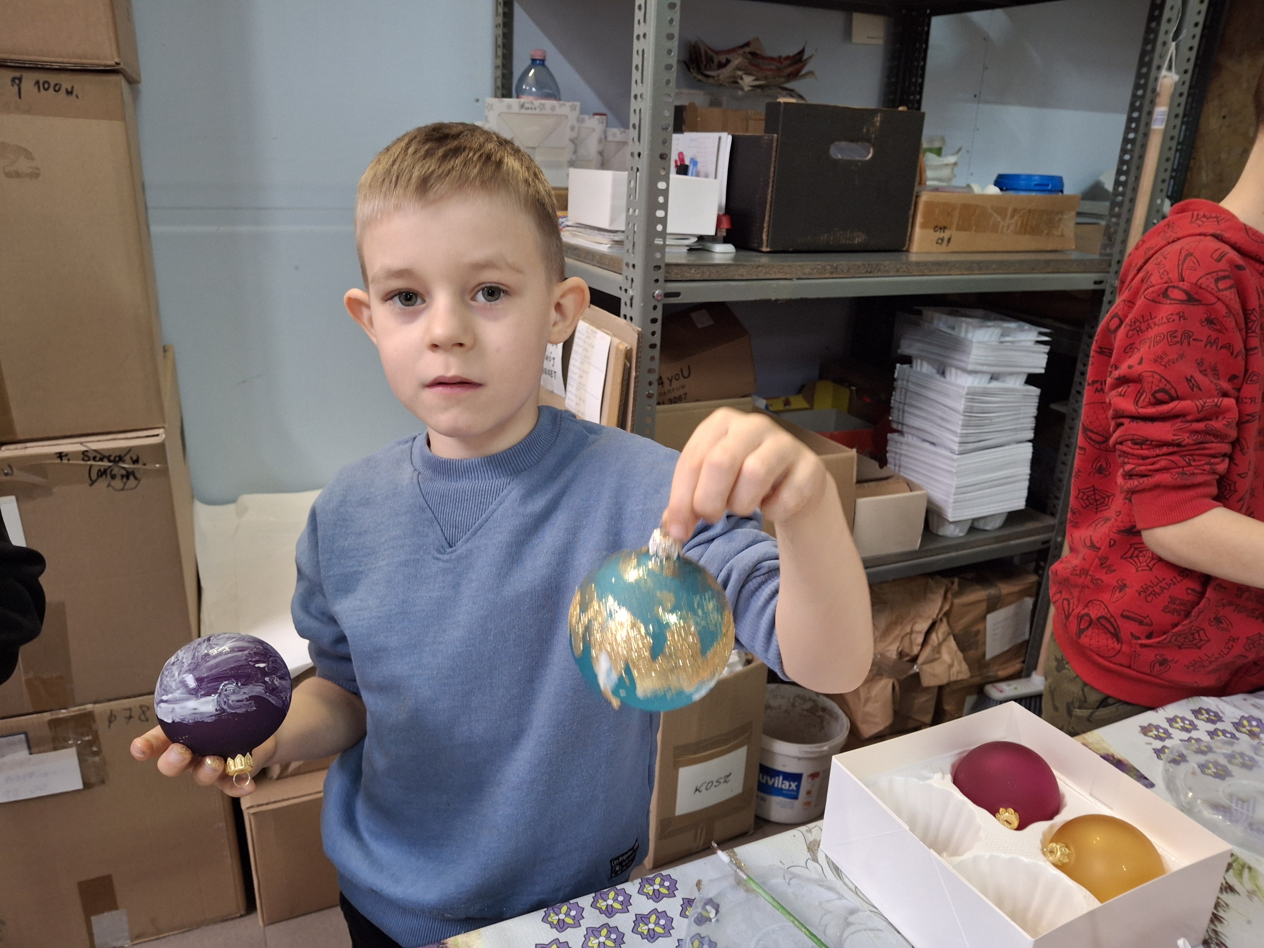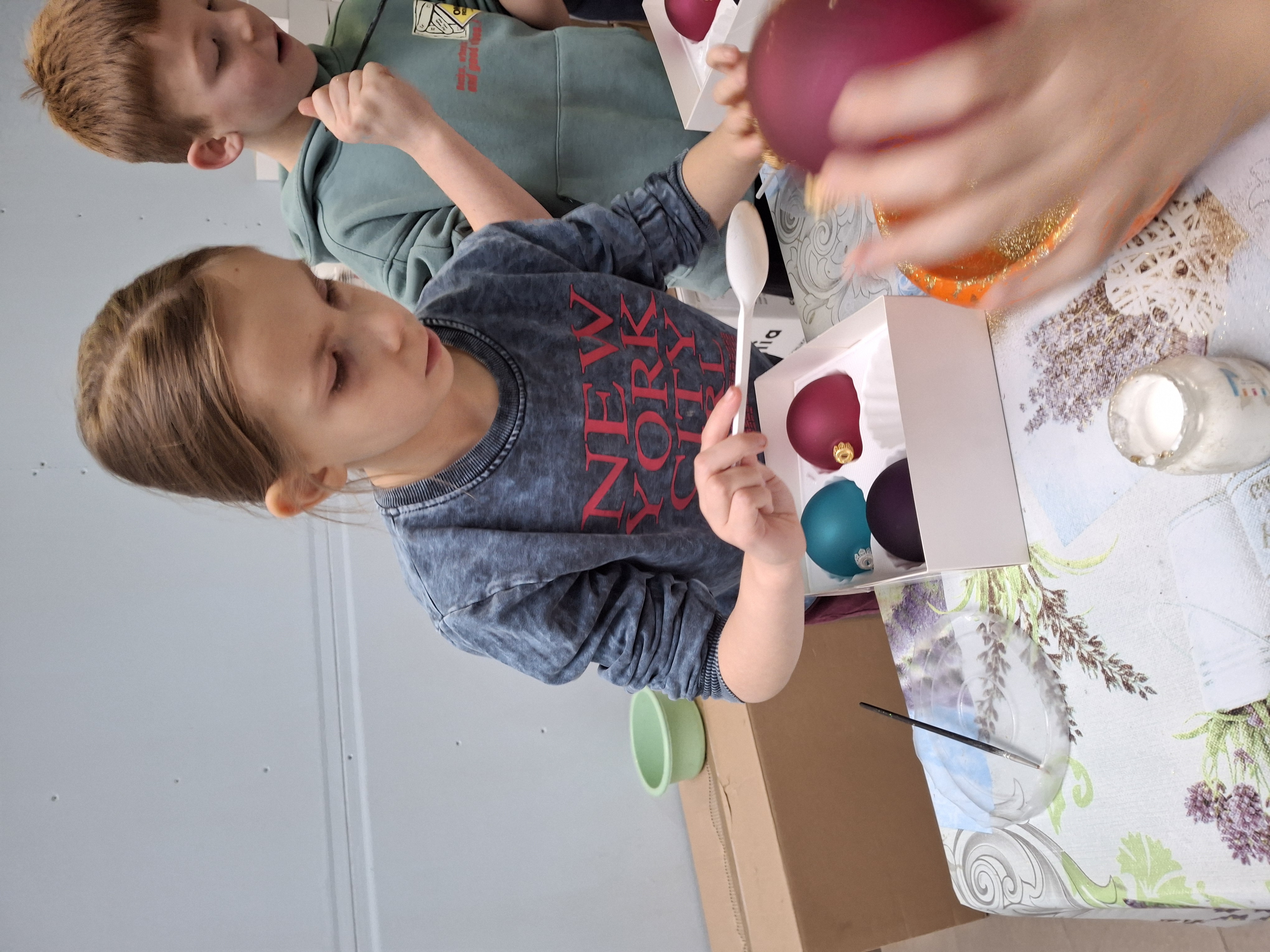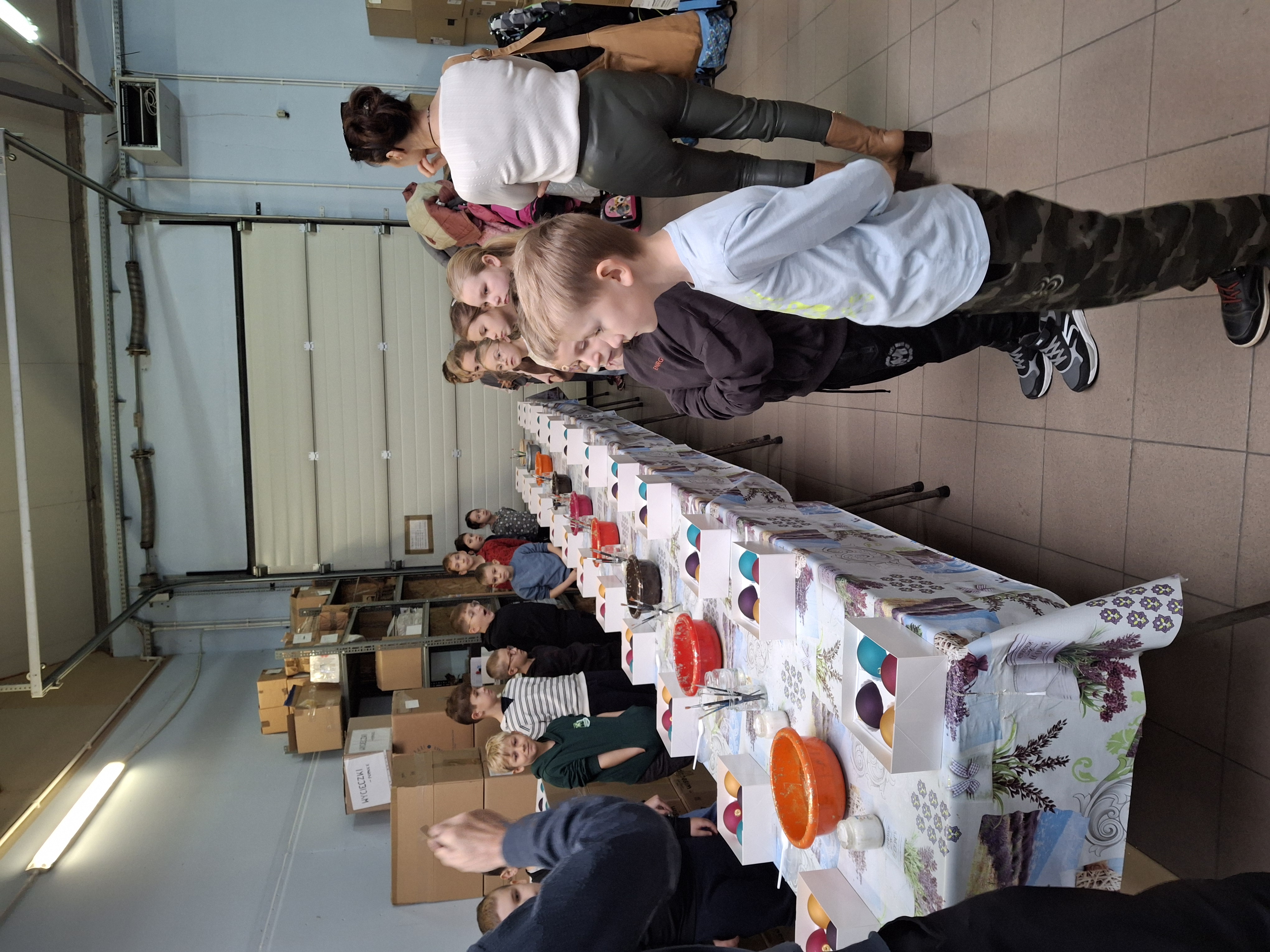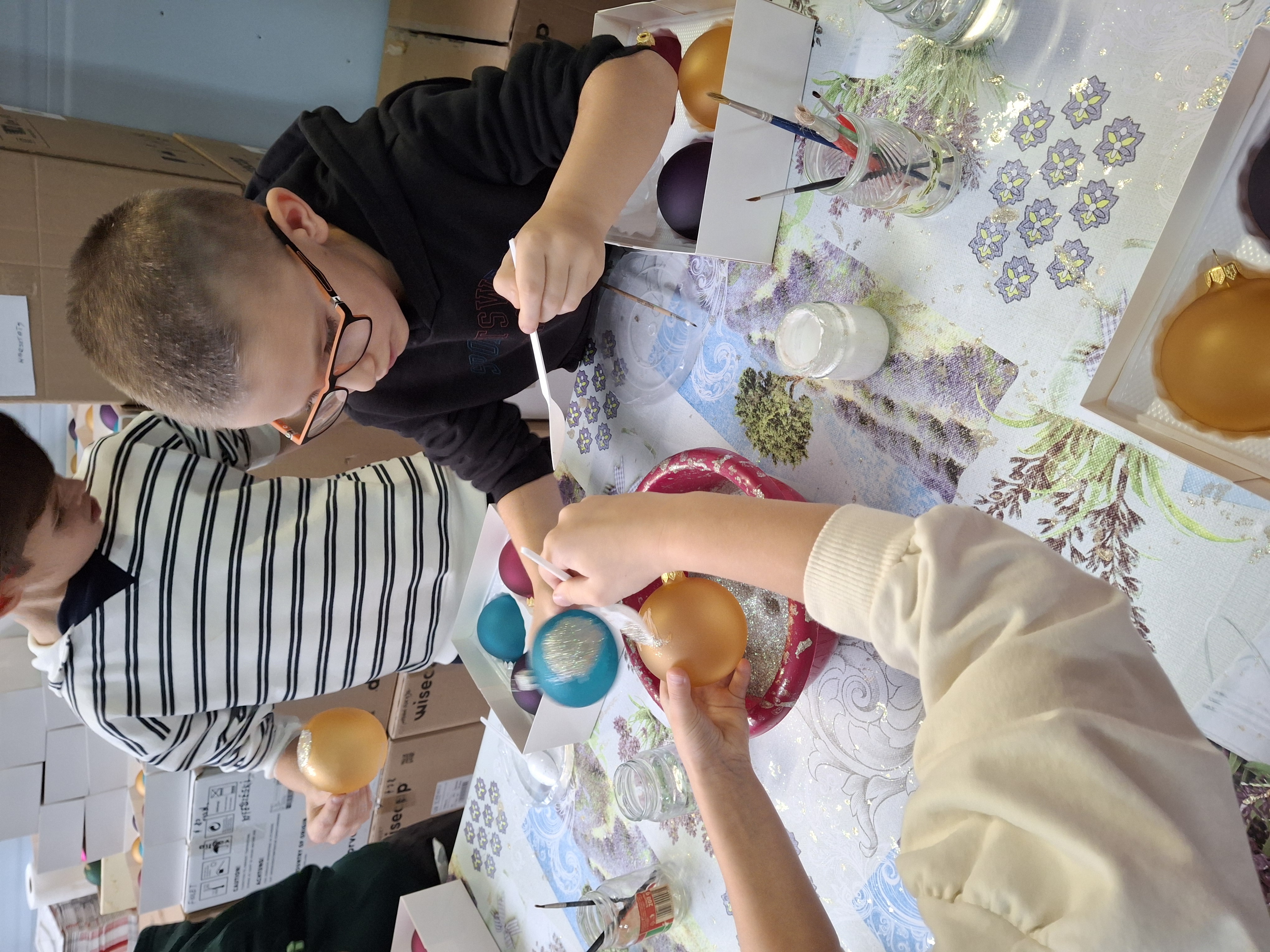 Największą atrakcją dla uczniów okazały się warsztaty plastyczne przygotowane na zakończenie wizyty. Każde dziecko miało możliwość własnoręcznie ozdobić cztery bombki, wykorzystując farby i brokat. Gotowe ozdoby zostały pięknie zapakowane, aby uczniowie mogli bezpiecznie zabrać je do domu i pochwalić się efektem swojej pracy.